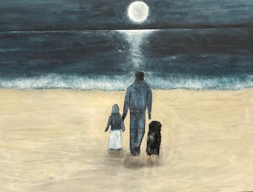 Painting of a man, his daughter and their dog, soaking in the peace and tranquillity of the scene.